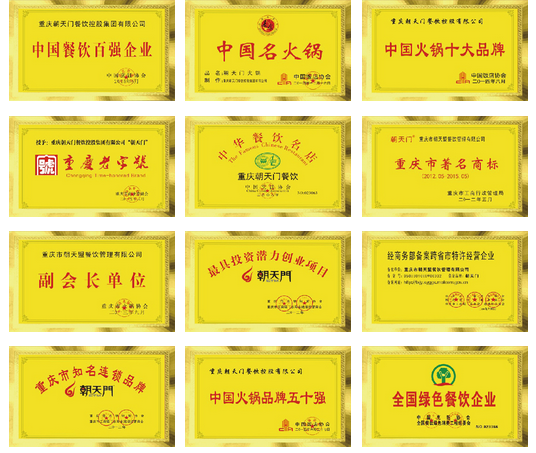 朝天門火鍋憑借其濃郁醇厚的火鍋味道以及民眾的認(rèn)可度,獲得過”火鍋品牌五十強(qiáng)”、“全國綠色餐飲企業(yè)”、“中國五星級火鍋企業(yè)”、“重慶老字號”、“中國火鍋領(lǐng)軍品牌”等多項(xiàng)榮譽(yù)。