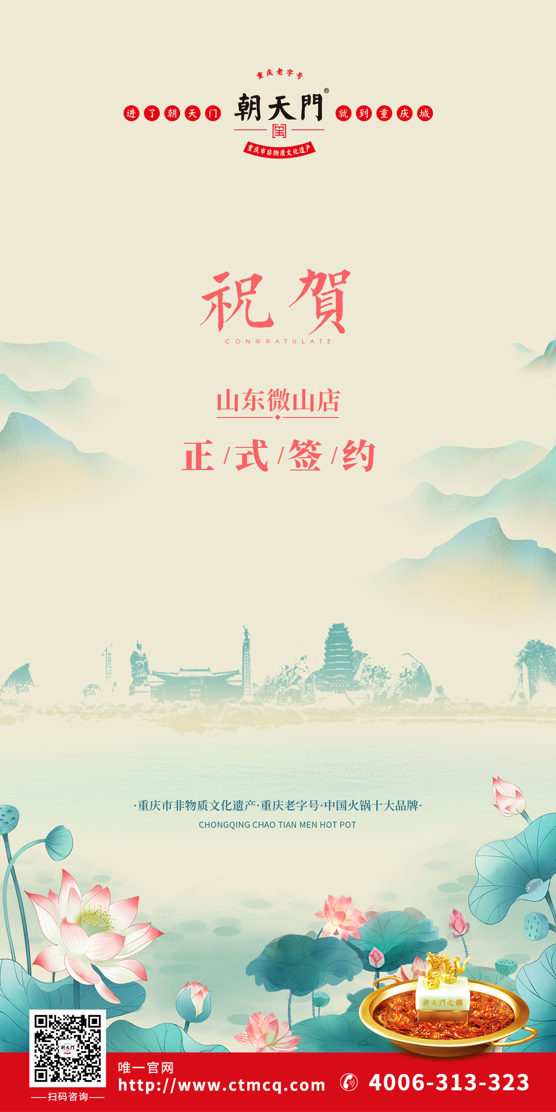 在此,我們?nèi)f分感謝馬總對(duì)朝天門火鍋的支持與信任,我們將竭盡全力為馬總服務(wù),確保朝天門火鍋山東濟(jì)寧微山店能順利開業(yè),紅火運(yùn)營(yíng)。最后祝開業(yè)大吉,財(cái)源滾滾!