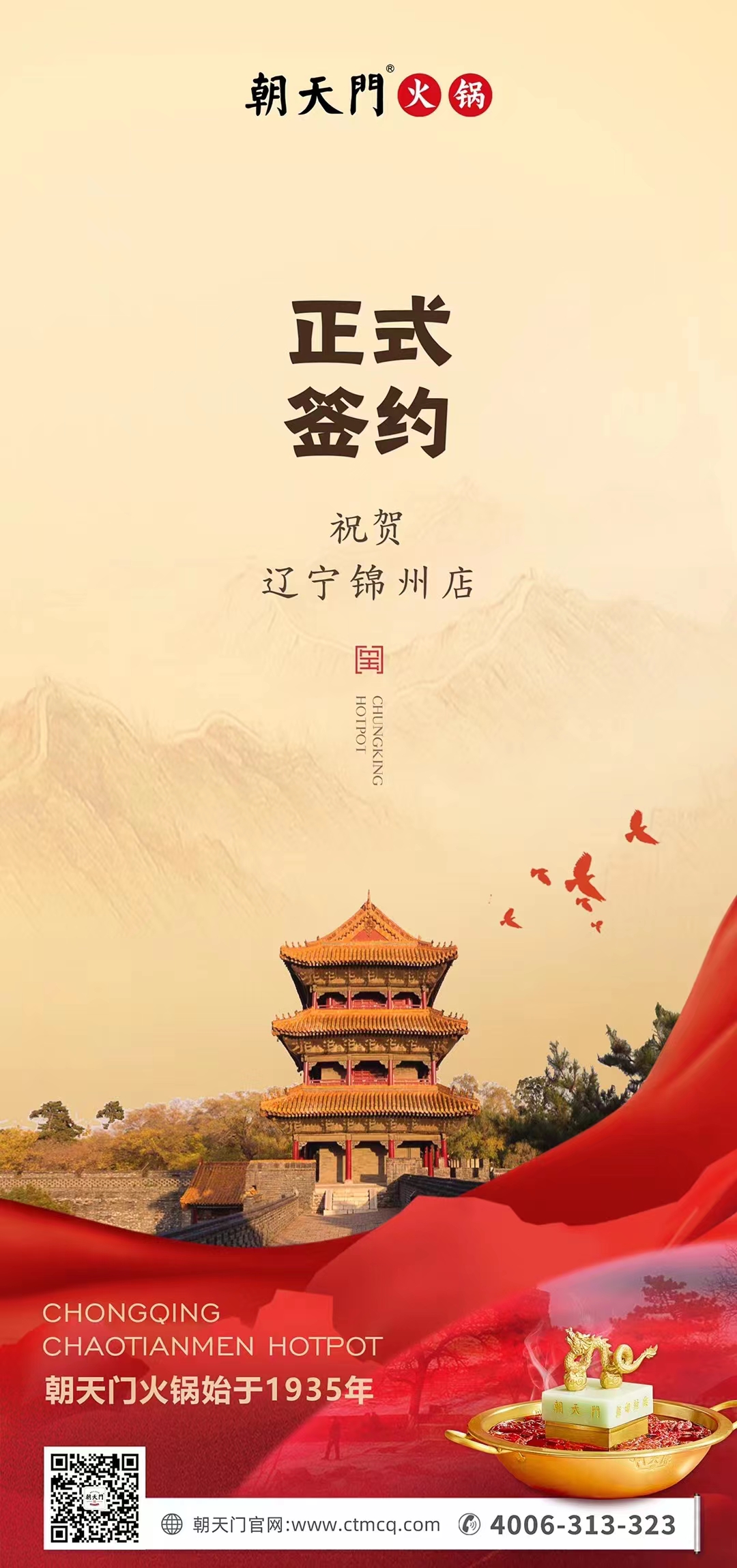 非常感謝遼寧錦州齊女士選擇加入朝天門這個(gè)有力量的大家庭,這是對(duì)朝天門火鍋品牌的認(rèn)可與支持,面對(duì)如今風(fēng)云涌動(dòng)的餐飲市場(chǎng),朝天門擁有后端穩(wěn)定的供應(yīng)鏈及完善成熟的營運(yùn)體系,勢(shì)必在錦州餐飲市場(chǎng)砸出新的浪花,也提前預(yù)祝齊總生意興隆,財(cái)源廣進(jìn)!