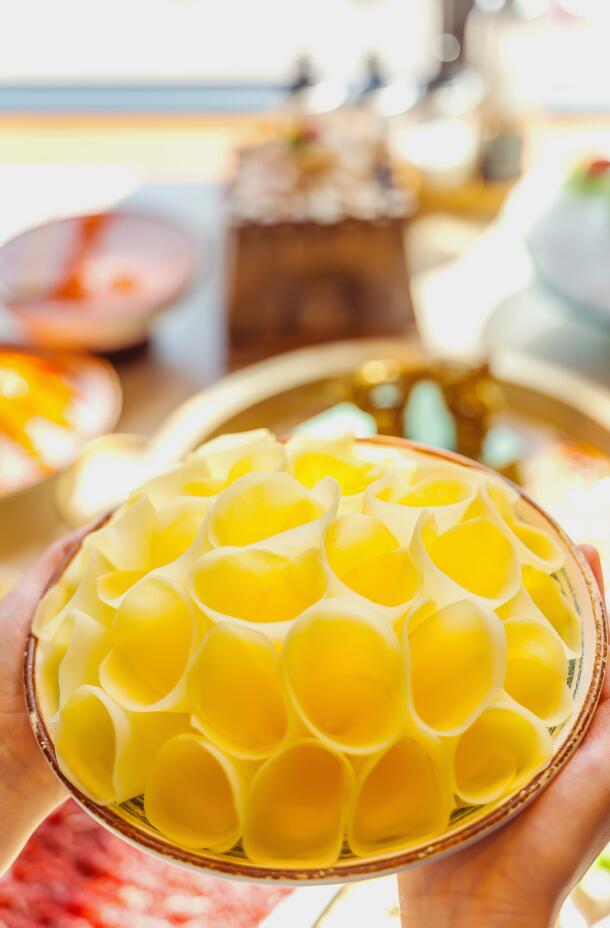 將土豆切成薄片,薄度接近半透明,用水沖去粉質(zhì),再將薄如紙片的土豆片卷成花束形狀,一束束插入碗中,在麻辣鮮香的紅油鍋底里燙8秒,土豆卷舒展開來,口感格外爽脆。